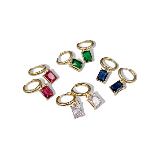 Crafted in 18K gold-plated stainless steel, each huggie features a sleek rectangular-cut zircon stone, available in four luminous shades: ruby red, sapphire blue, crystal white, and emerald green. Designed for long-lasting brilliance, the fade- and tarnish-resistant gold plating keeps its radiant glow wear after wear.